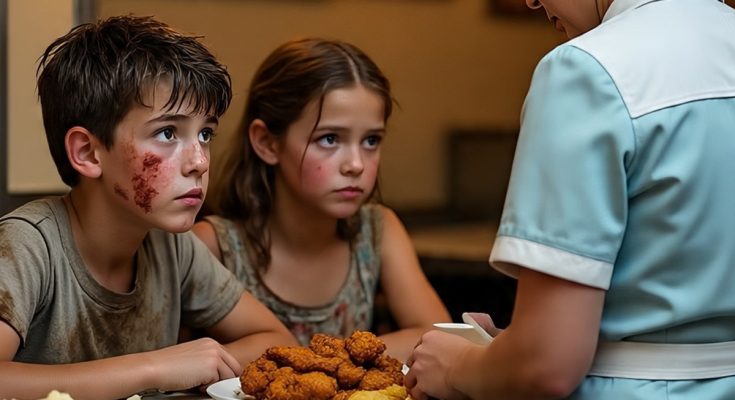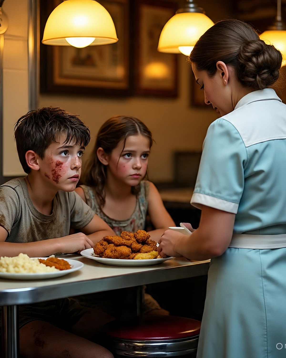 Minutos después, regresó con platos de pollo asado, puré de papas y maíz con mantequilla. La niña se subió a un taburete, agarrando el tenedor como si fuera un tesoro. El niño dudó, pero luego dio el primer bocado lentamente, con lágrimas en los ojos, no por el calor, sino por algo mucho más profundo.