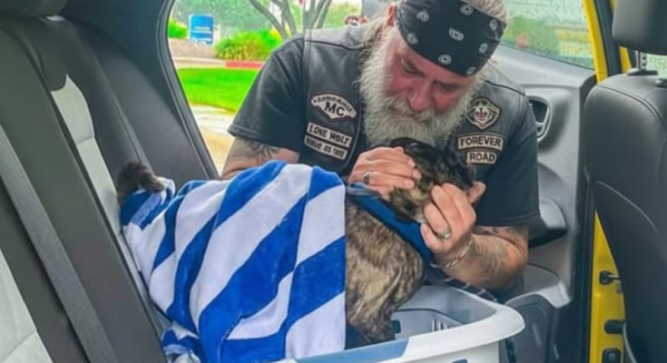 The biker was bent over the puppy, stroking her head with one massive, tattooed finger. “Stay with me, baby girl,” he whispered. “Please stay with me. You’re gonna be okay. I promise you’re gonna be okay.”