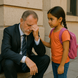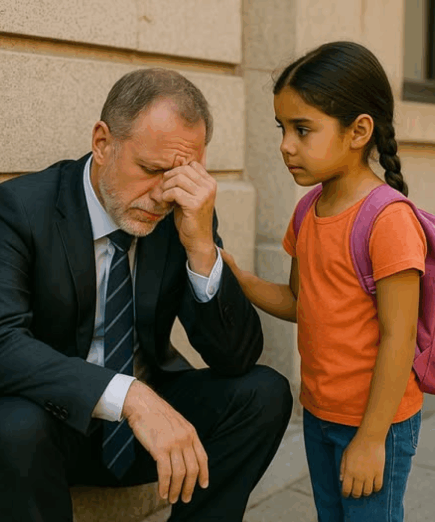 “Un millonario fue visto llorando solo en la acera, con el traje arrugado y la mirada perdida. Nadie se atrevió a acercarse… excepto una niña que le ofreció algo simple. Lo que ella le dijo cambió su forma de ver la vida, y su historia conmovió a todo el país.”