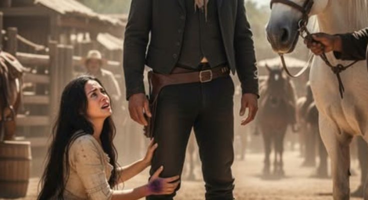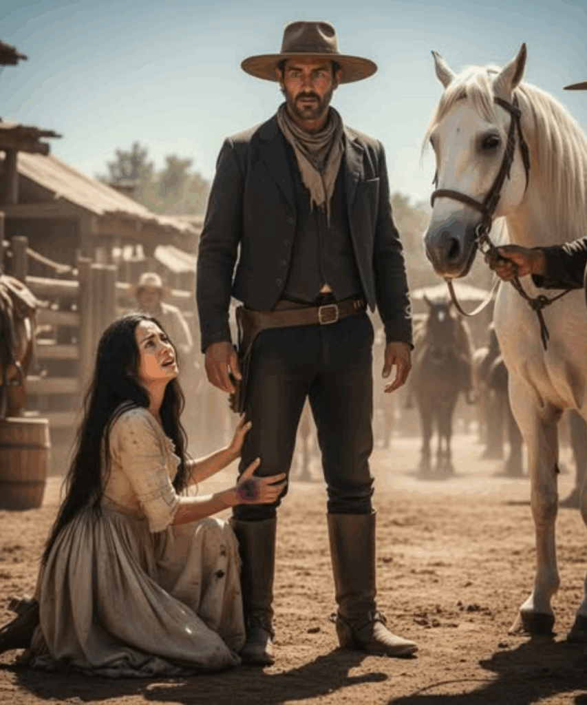 Estaba mostrando un caballo blanco a Santiago cuando la mujer se acercó corriendo. “No compres el caballo”, gritó con voz quebrada. “Cómprame a mí, ranchero. Seré tuya para siempre.” Santiago se quedó helado. ¿Qué estaba pasando aquí? La mujer se tiró a sus pies, agarrando sus botas con manos temblorosas. “Por favor”, siguió llorando.