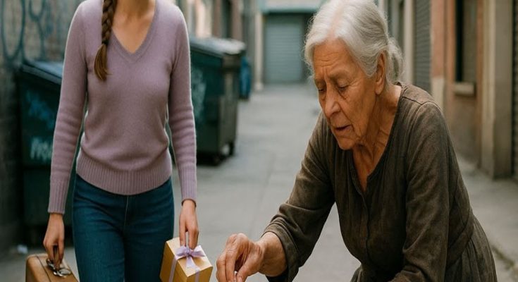 Era una figura pequeña, encorbada, vestida con varias capas de ropa sucia y rasgada. Estaba rebuscando dentro de una bolsa de basura con movimientos lentos y cuidadosos, como si estuviera buscando un tesoro. Sus manos, temblorosas y arrugadas, apartaban envolturas y desperdicios. Junto a ella había una pequeña bolsa de tela donde aparentemente guardaba lo que encontraba.