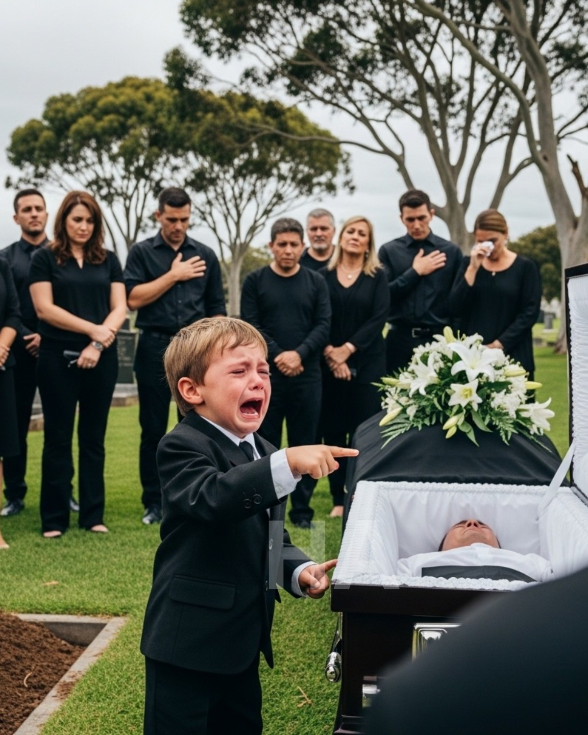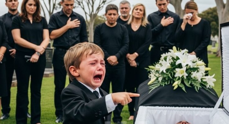 Mientras el sacerdote pronunciaba sus últimas palabras, Emily sostenía a Noah contra su pecho. Había esperado que el niño, tan pequeño e inocente, no comprendiera lo que estaba ocurriendo. Estaba equivocada. Noah, que había permanecido en silencio durante la ceremonia, de repente empezó a inquietarse. Su pequeña mano se alzó señalando el ataúd, con los ojos abiertos de confusión y miedo. Emily trató de calmarlo, pero era como si el niño no pudiera oírla. Estaba completamente fijado en el féretro, y su dedito temblaba mientras lo señalaba.