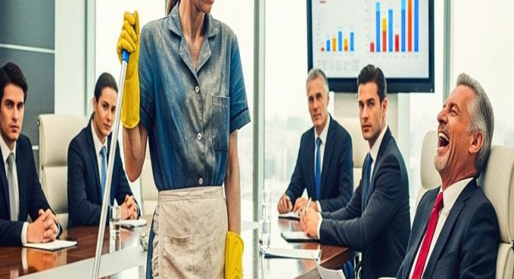 Su uniforme de servicio doméstico estaba mojado y arrastraba un carrito de suministros de limpieza. “Disculpen, señores. ¿Vengo a recoger la basura?”, preguntó tímidamente, sosteniendo una bolsa negra. Uno de los guardias corporativos avanzó rápidamente. “Señora, tiene prohibido estar en esta sala de juntas.” Pero Rodrigo levantó su mano con fastidio. ¿Qué más da? Ya está aquí.