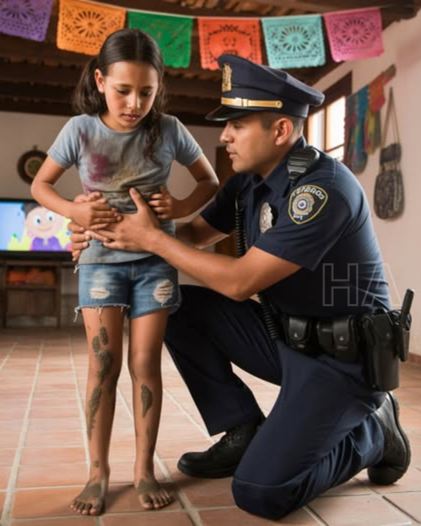 Pero lo que más lo alarmó fue su abdomen inflamado, visible aún bajo su gastada camiseta azul. Hola, Liliana. Soy el oficial López. Se arrodilló a su altura. ¿Puedes mostrarme que te molesta? Liliana levantó su camiseta apenas lo suficiente para mostrar su vientre hinchado, la piel estirada. “Fueron papá y su amigo”, susurró con lágrimas en los ojos. “Ellos me hicieron esto.” Mientras el oficial López pedía una ambulancia, ni él ni Liliana notaron a la vecina anciana mirando tras las cortinas de encaje al otro lado de la calle.