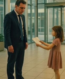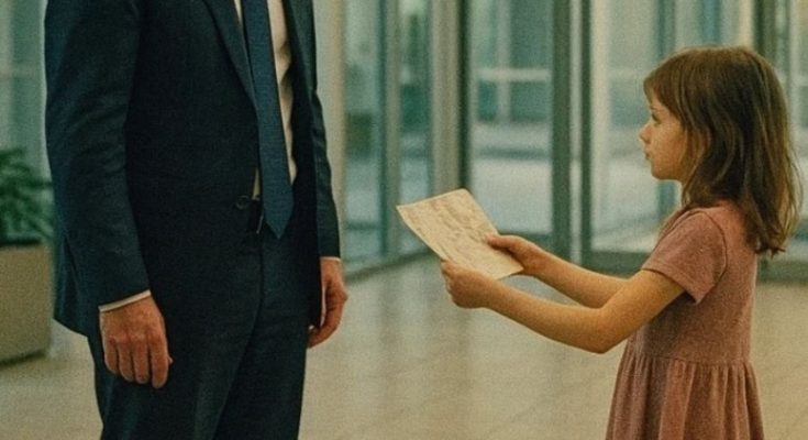 La voz temblorosa de una niña de siete años rompió el silencio elegante del vestíbulo de cristal de una gran empresa tecnológica. Sus manos pequeñas apretaban un sobre arrugado como si fuera un tesoro.