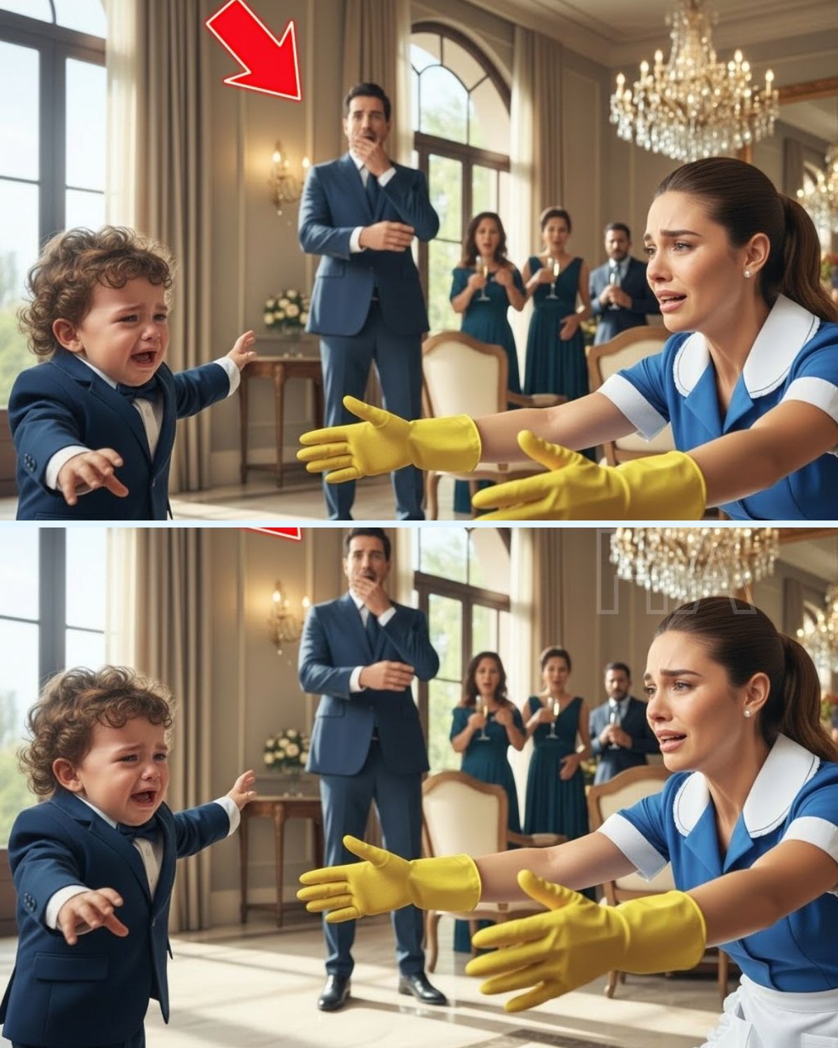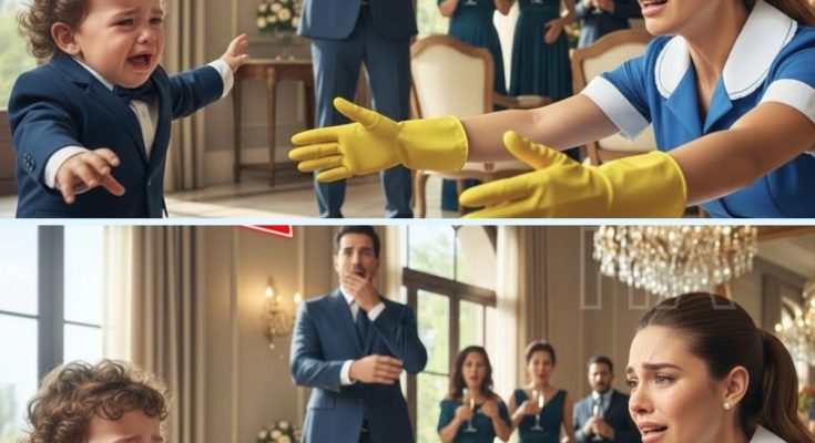 El cristal de las copas aún vibraba cuando el silencio cayó sobre el salón. Cincuenta invitados de la alta sociedad miraban la misma escena sin entender nada: el hijo del millonario, el pequeño Matías de dos años, corría por el piso de mármol, con las mejillas rojas de tanto llorar, directo hacia… la empleada de limpieza.
