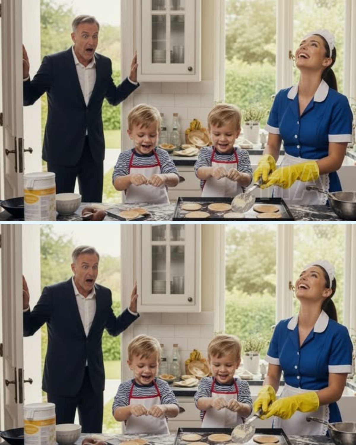 La cocina impecable de granito negro era ahora un pequeño caos luminoso: harina por el piso, cáscaras de huevo por todos lados, leche derramada, sartenes humeantes. Y, en medio de ese desastre, estaban Santi y Leo, de pie sobre la encimera, con delantales enormes manchados de masa y chocolate, las mejillas rojas, los ojos brillando de felicidad. Reían, gritaban, se movían sin miedo.