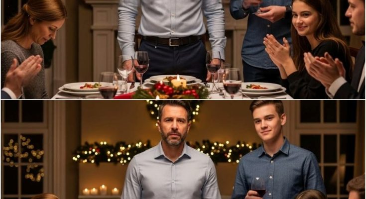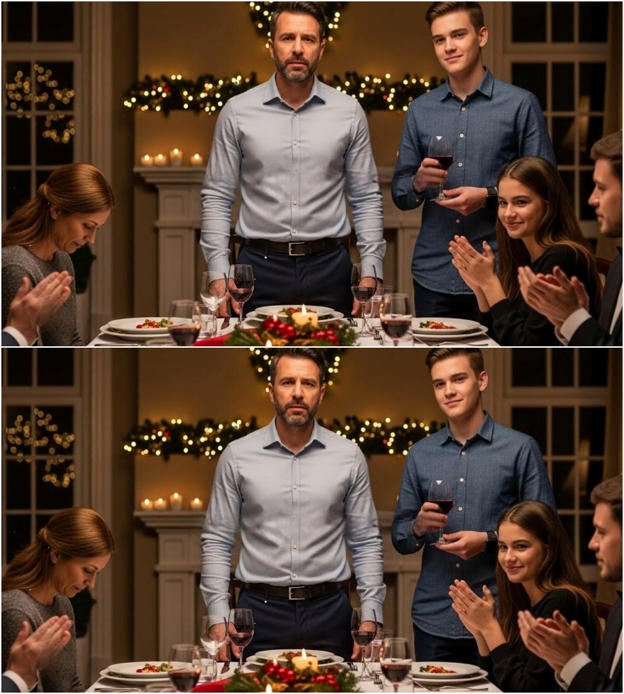 Algo dentro de mí comenzó a romperse. Entonces sucedió el momento que cambiaría todo. Sebastián, envalentonado quizás por la presencia de su padre biológico o simplemente cansado de fingir educación, se puso de pie con una copa de cidra en la mano. “Quiero hacer un brindis”, anunció. Todos guardaron silencio. “Por papá, que siempre ha estado ahí para nosotros.” miró directamente a Fernando.