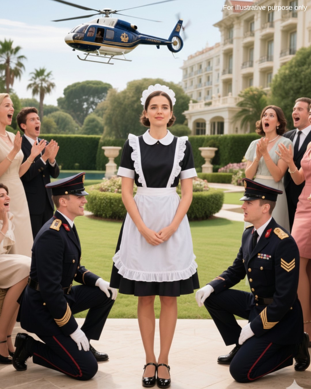 She wore a plain maid’s uniform—a white blouse, black skirt, and apron. No makeup.