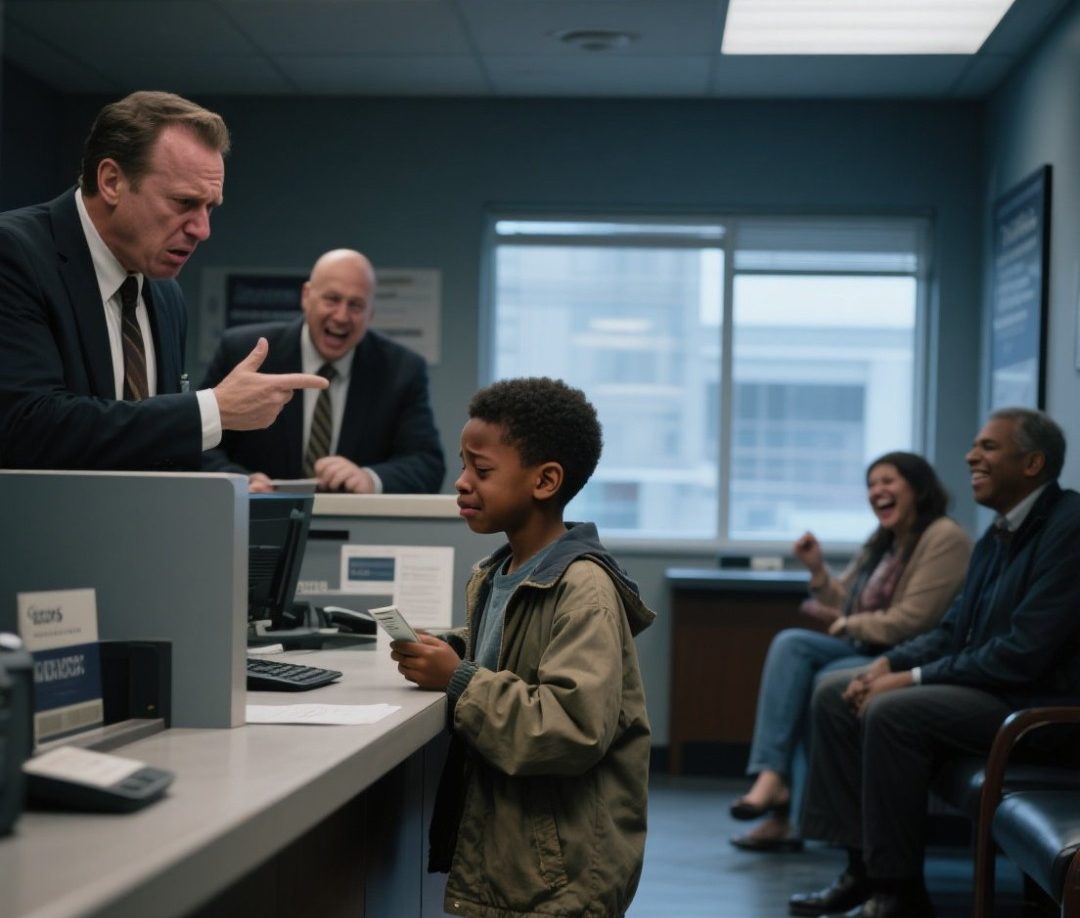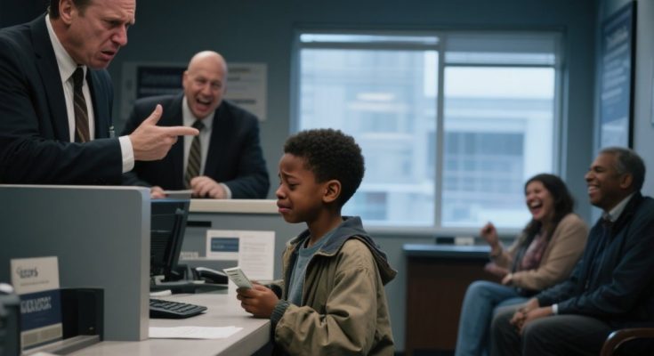 The bank manager, Tristan Vale, paused mid-motion and studied the boy as if he were a curiosity behind glass. Then a laugh broke out—low, sharp, and cruel—echoing off the marble walls. “Check your account?” he sneered. “This isn’t some charity. Who even let you in here?”