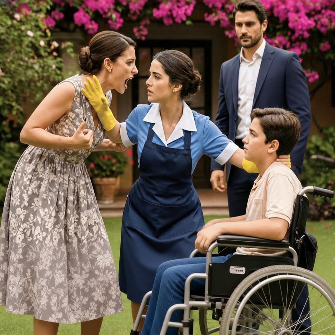 Su mano, perfectamente manicurada, se cerró como una garra de hierro alrededor del antebrazo de Carmen. Las uñas se clavaron en la piel, buscando hacer daño, buscando sangre. Carmen, con su uniforme azul impecable y los guantes de goma amarilla aún puestos, trastavilló hacia atrás, pero sus pies se plantaron en la tierra con una firmeza que nacía del puro instinto de supervivencia. No la suya, sino la del niño. Carmen no soltó la silla de ruedas. Sus dedos enguantados se aferraban al metal negro del reposabrazos con tal fuerza que los nudillos se le pusieron blancos bajo el látex.