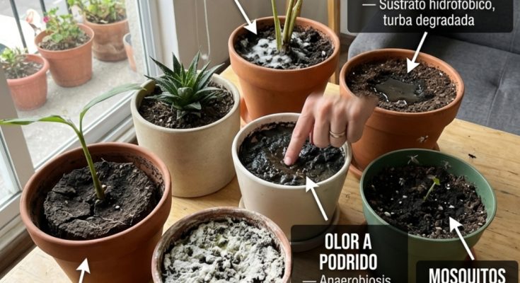 El sustrato de tus macetas habla todo el tiempo. El problema es que la mayoría lo mira solo cuando riega — y para entonces la señal que el sustrato llevaba días dando ya se convirtió en el síntoma que aparece en la hoja.
