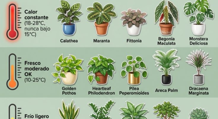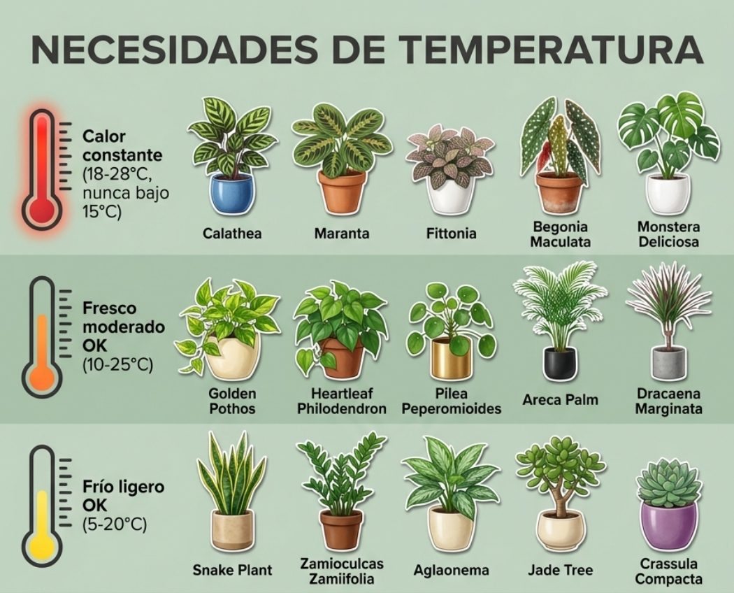 No todas las plantas de interior toleran la misma temperatura. Poner un helecho tropical junto a la ventana que se abre en enero o una suculenta encima del radiador es sentenciarlas con un factor que casi nadie mide — porque el termómetro de la sala no dice lo que pasa en la repisa.